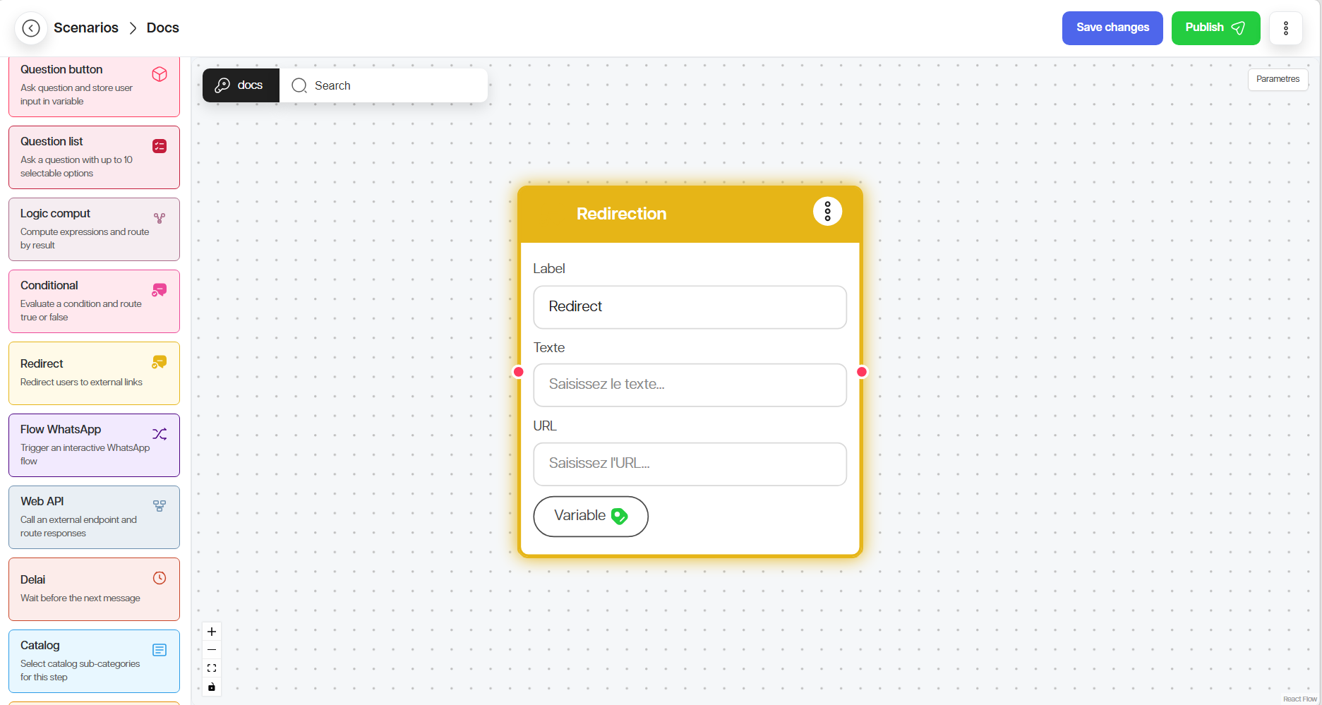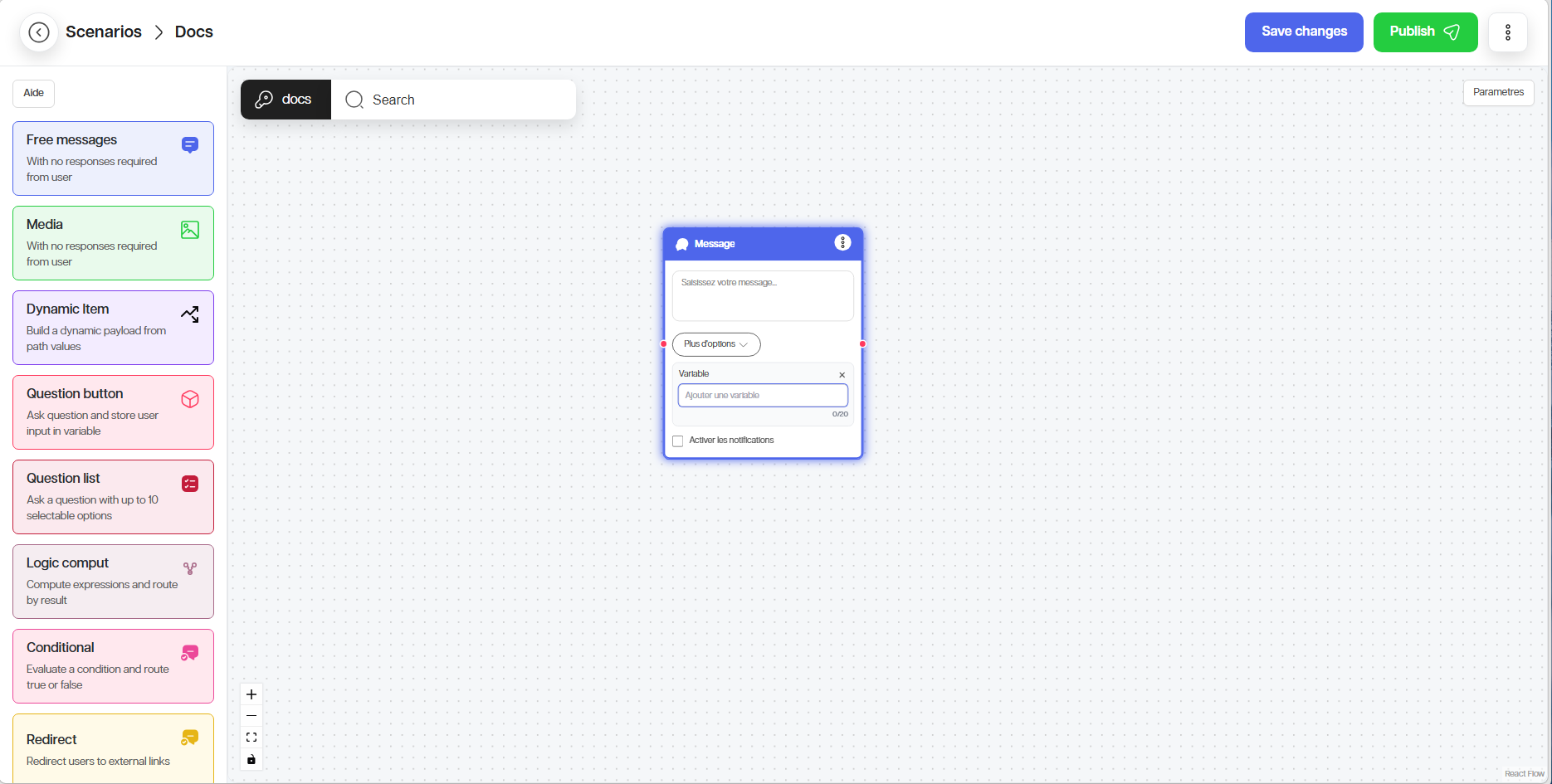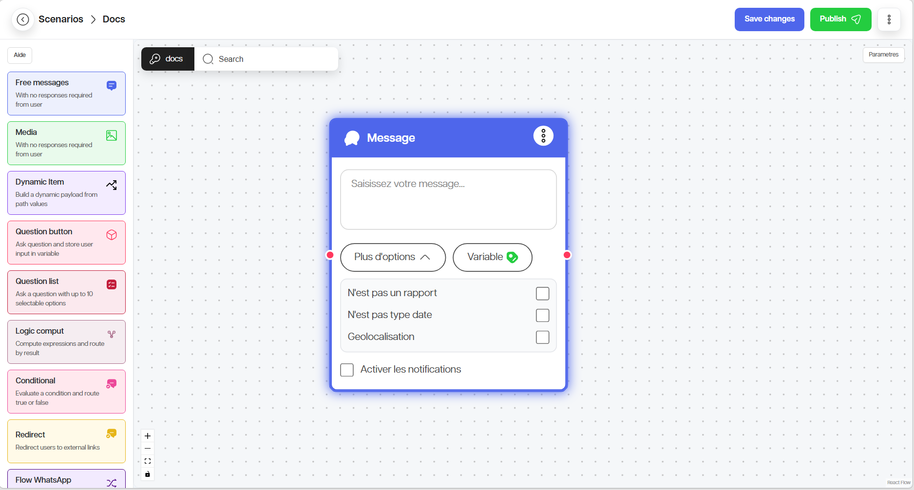 Le nœud Message envoie une information sans forcement attendre de réponse. Si vous souhaitez enregistrer la réponse de l’utilisateur, définissez une variable.