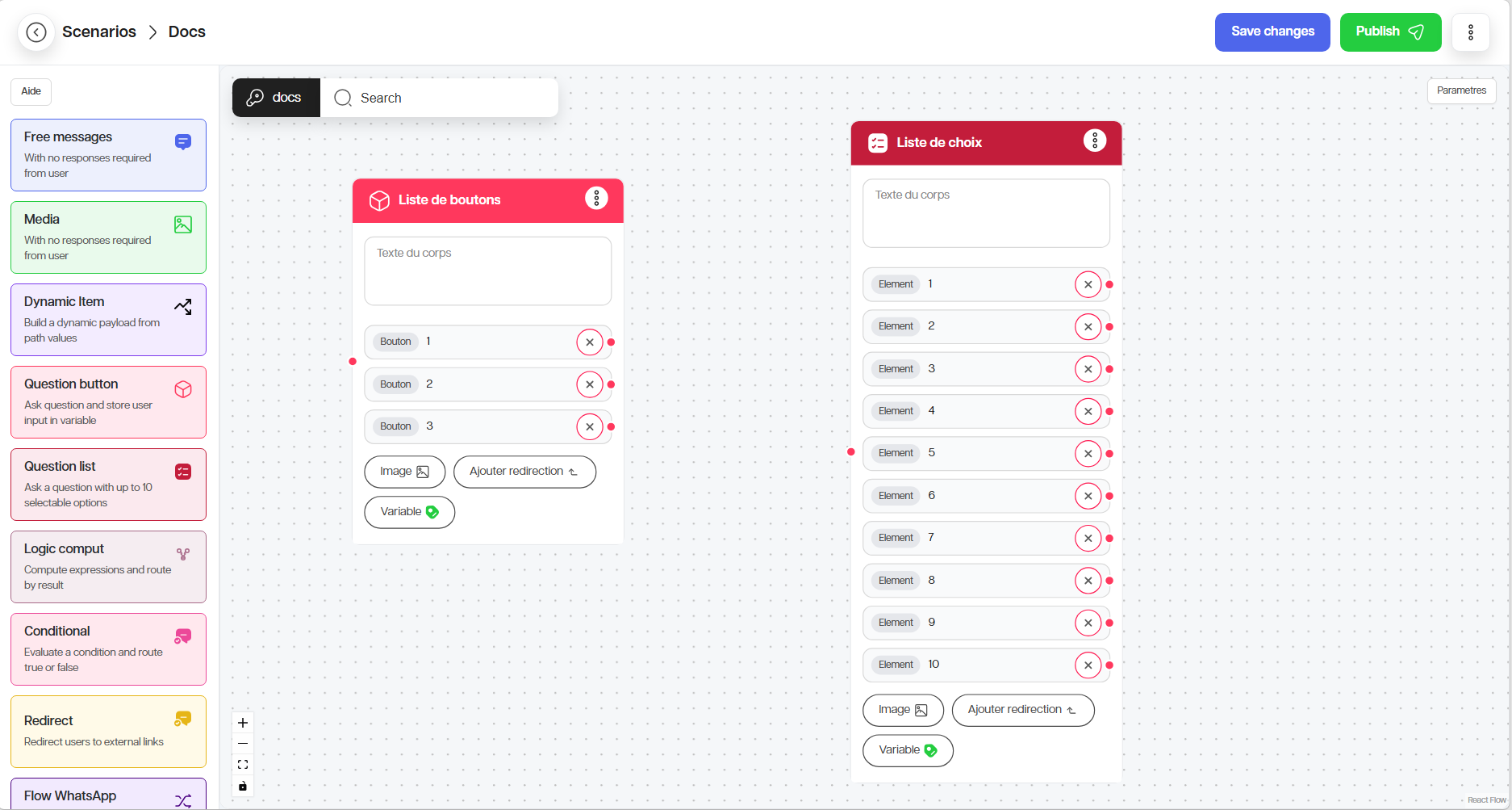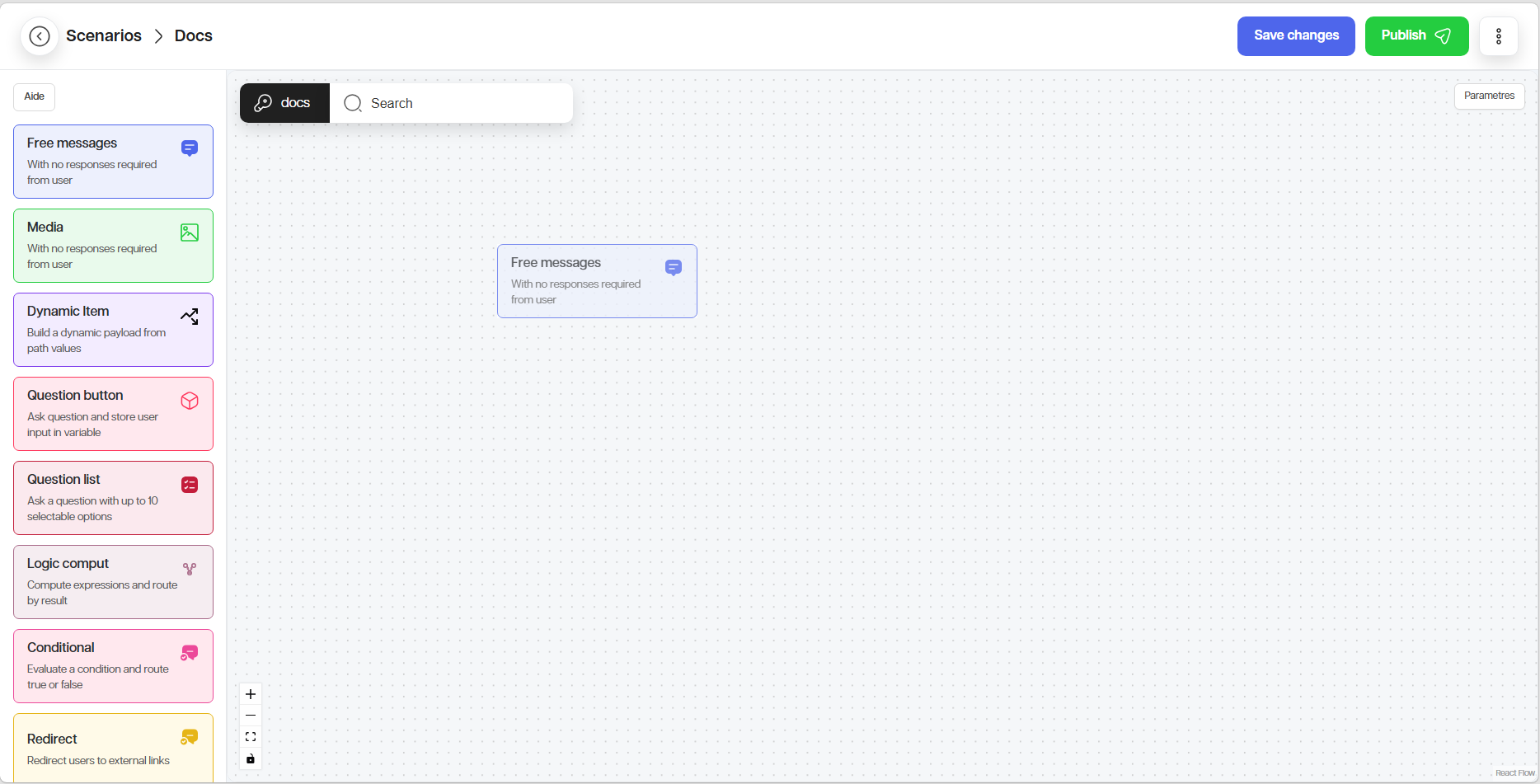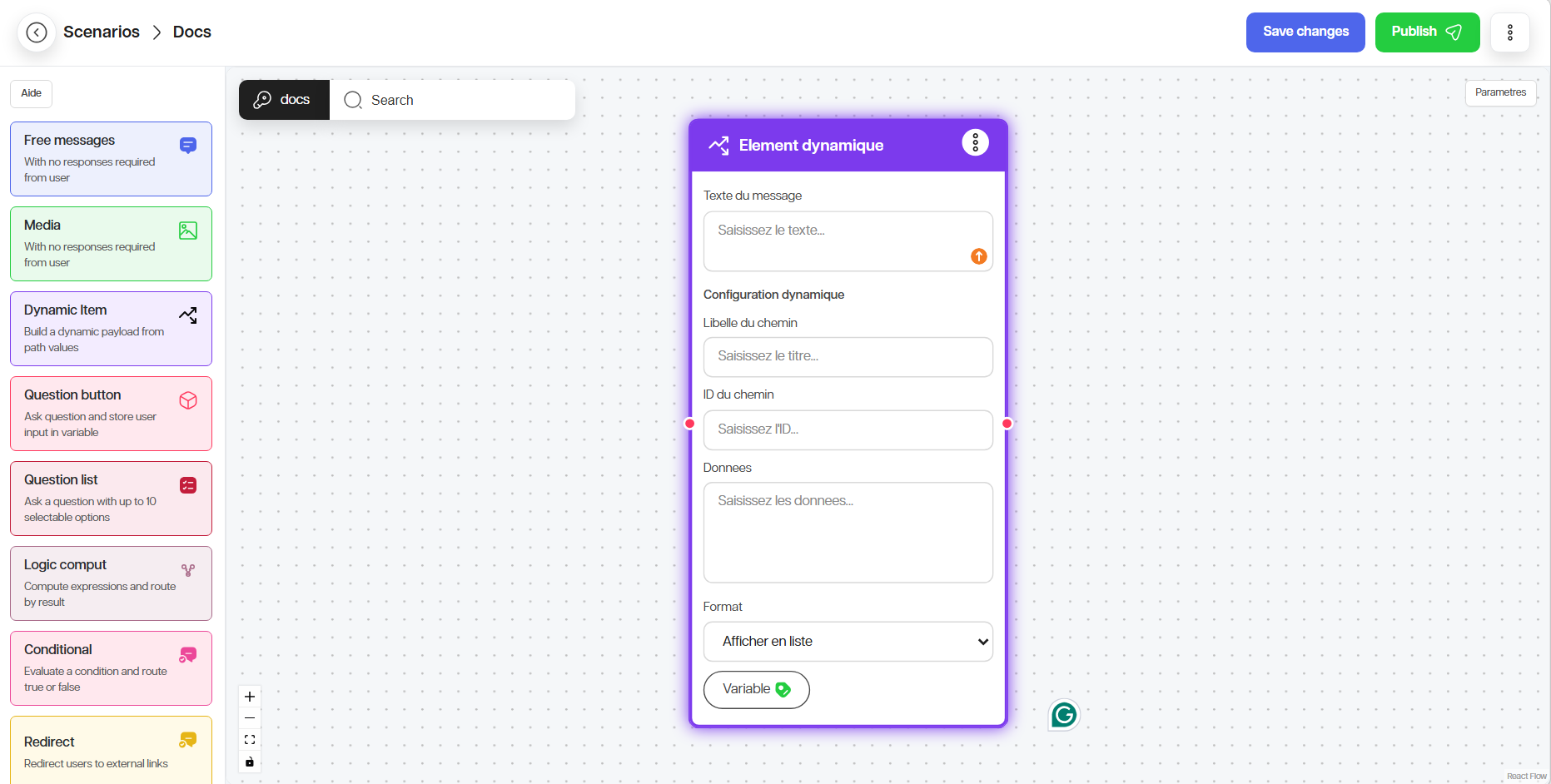 Le nœud Message envoie une information sans forcement attendre de réponse. Si vous souhaitez enregistrer la réponse de l’utilisateur, définissez une variable.