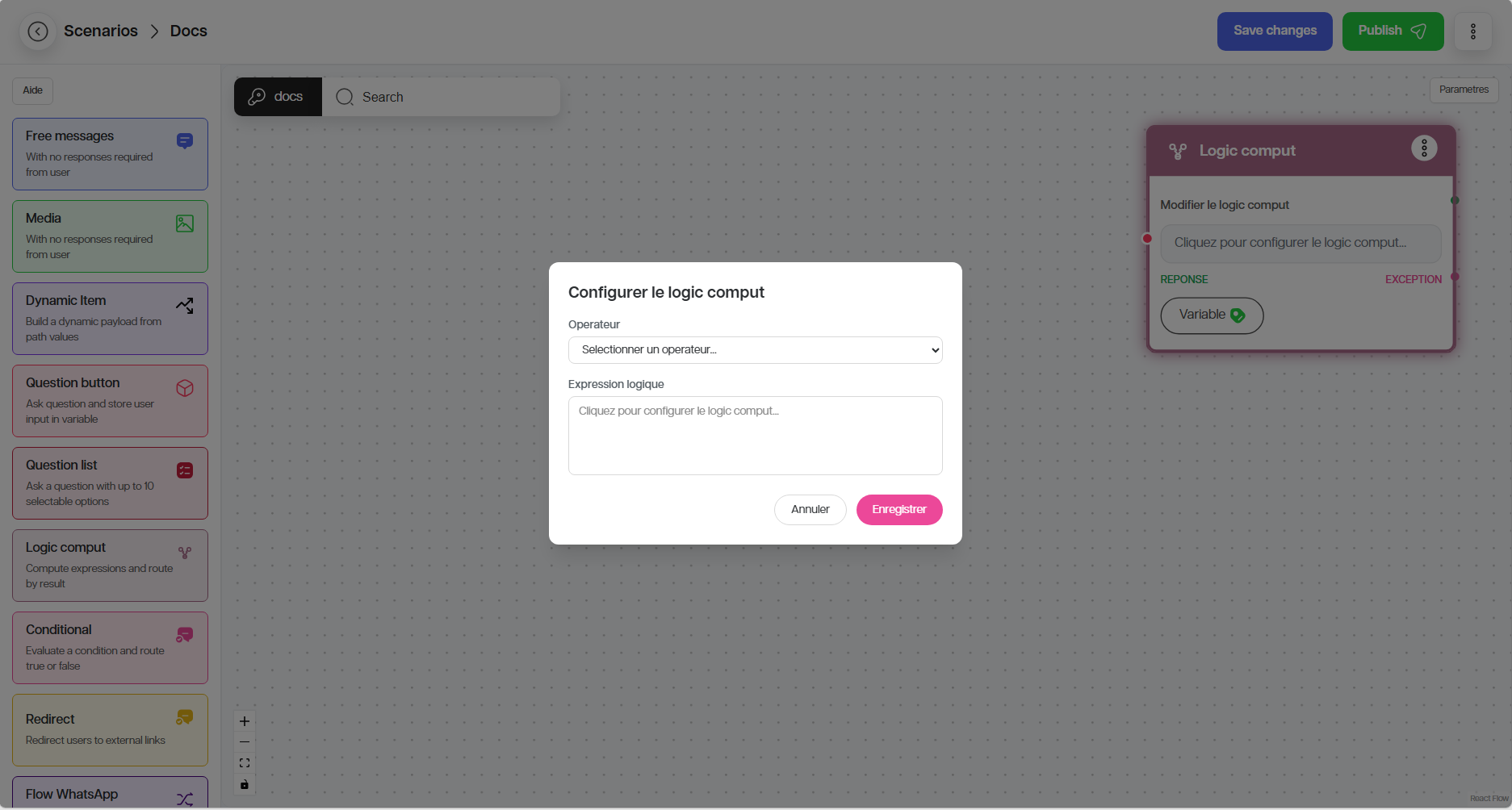 Le nœud Logic Compute calcule ou évalue une expression. Il est utile pour transformer une valeur ou appliquer une règle avant une condition.