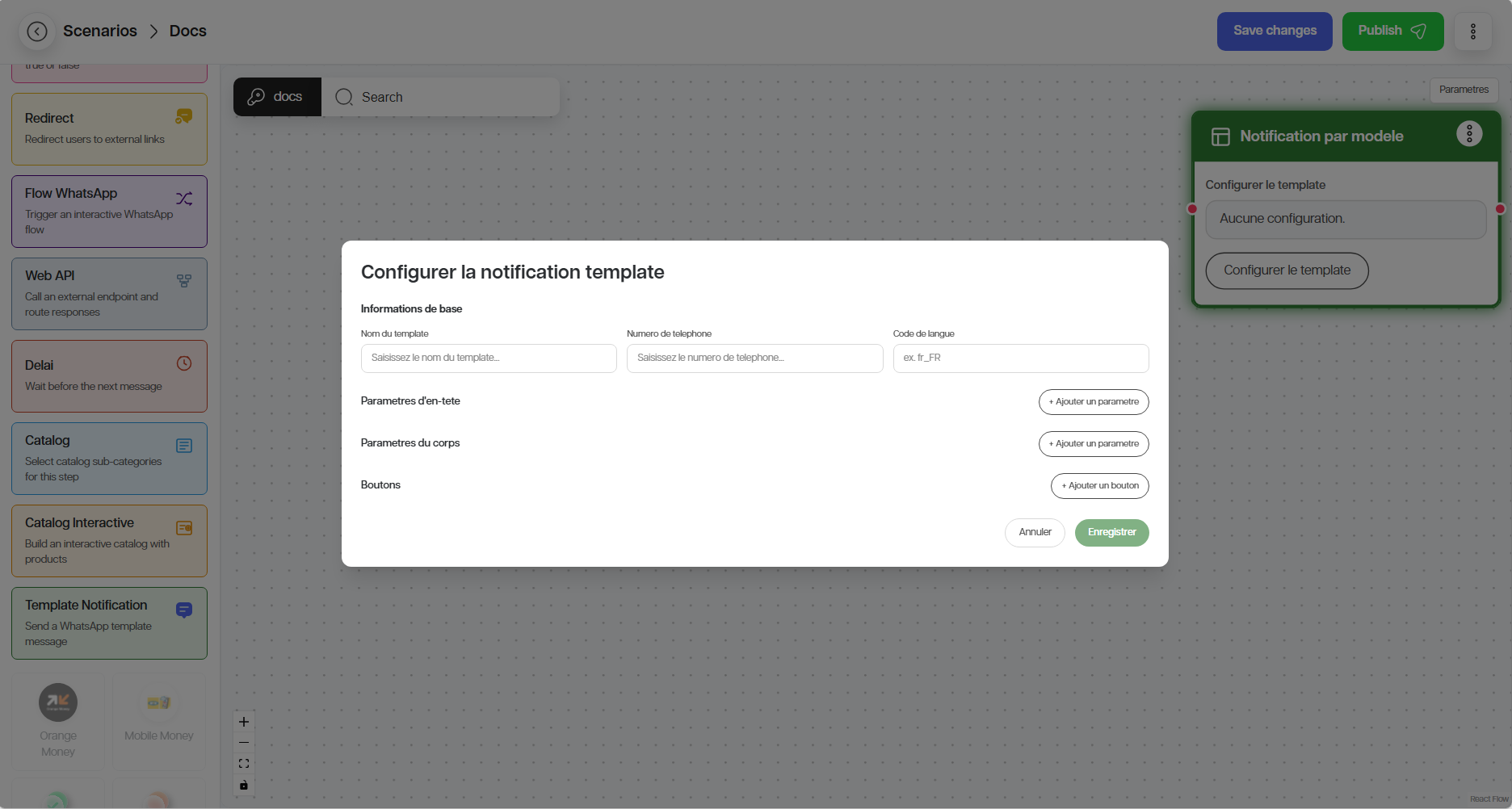 6. Ajoutez les variables de personnalisation si nécessaire (paramètres d’en-tête, paramètres de corps, et les boutons).