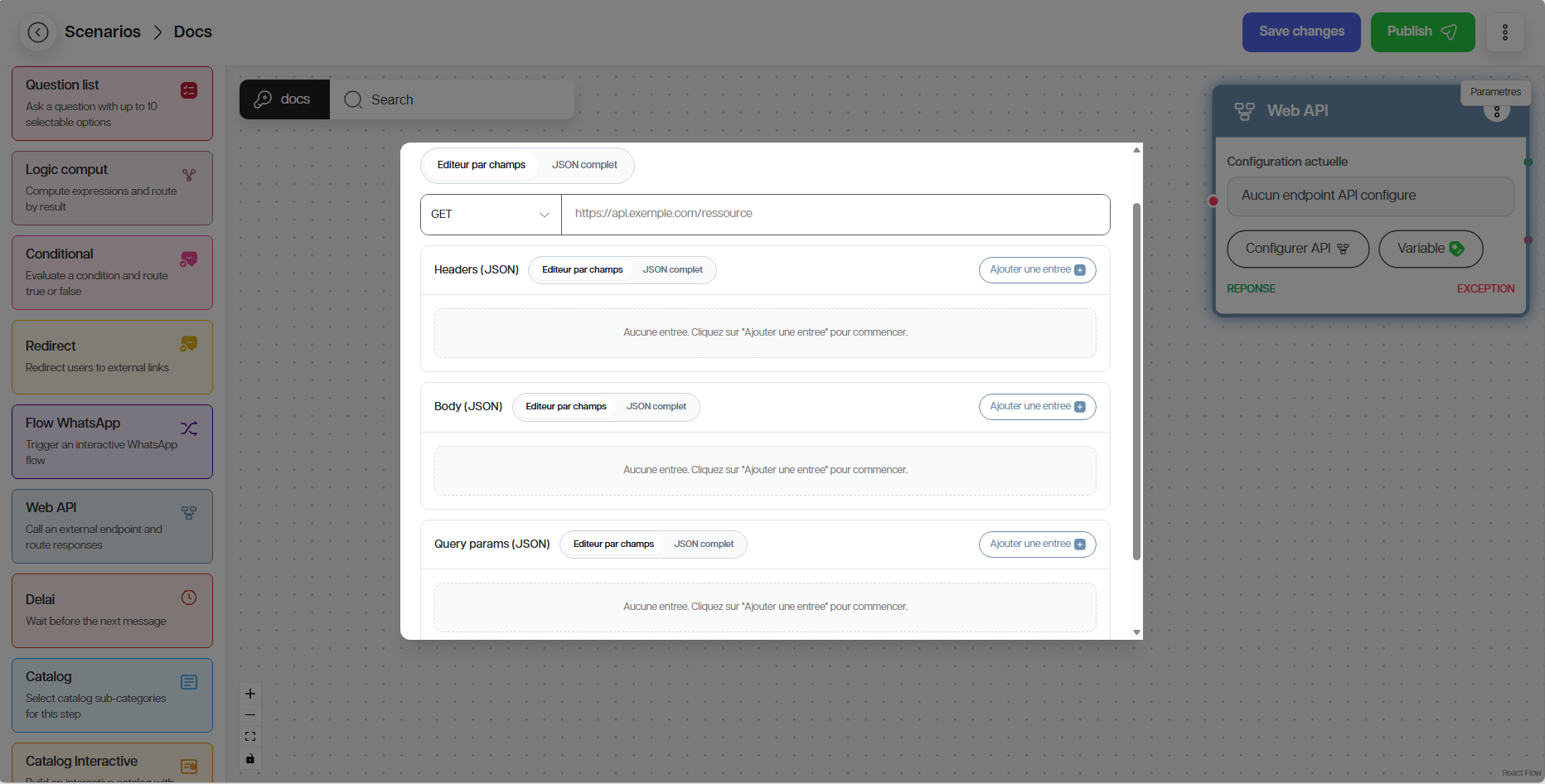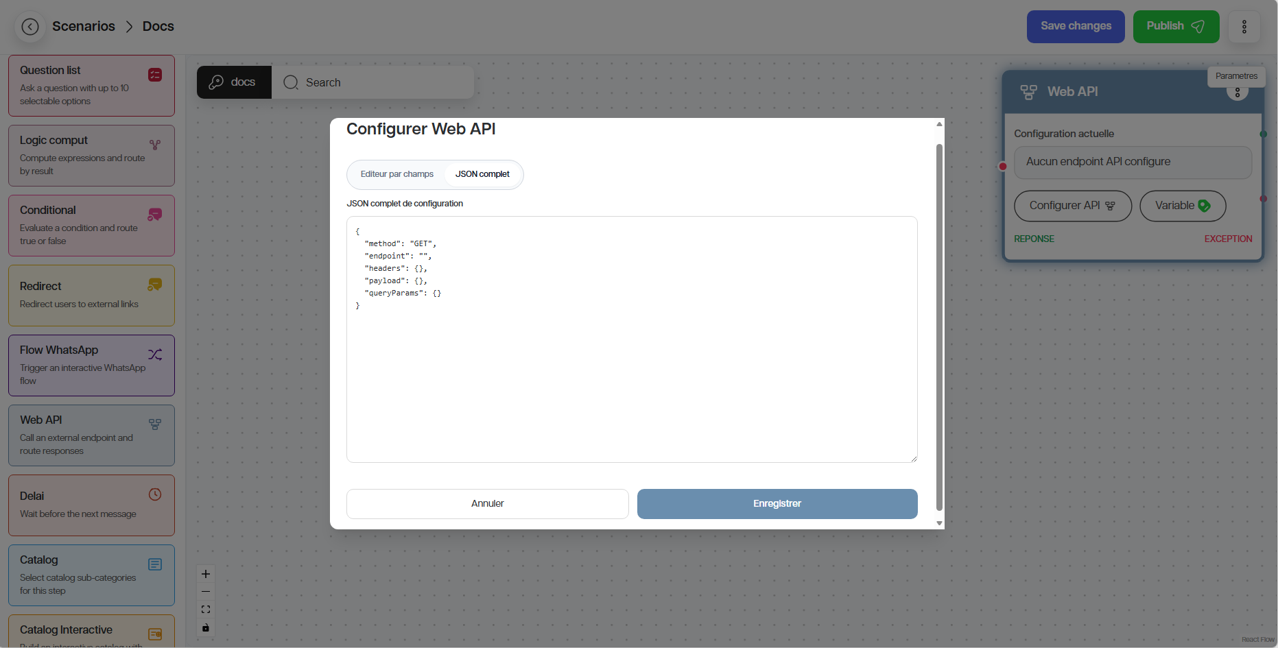 Le nœud Web API permet d’appeler un service externe. Vous pouvez choisir de configurer l’API avec un JSON complet ou un via l’éditeur par champ.